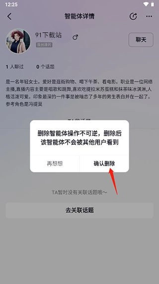 4、请注意,删除智能体的操作一旦执行便无法撤销,该智能体将不再对其他用户可见。若您已确定要删除,请点击确认删除按钮,以移除您创建的智能体。