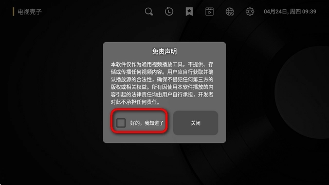 1、点击查看免责声明进入电视壳子软件。