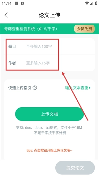 3、在填写好题目与作者信息后,点击【上传文档】按钮即可上传文件。此功能支持doc、docx、txt格式的文档,且要求上传的文件大小不超过15M。