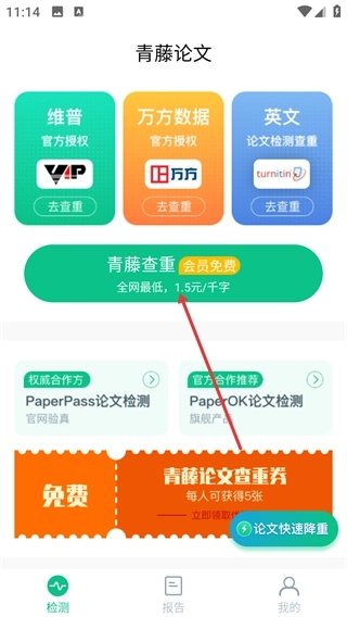 1、在主界面选择【青藤查重】功能选项,该功能对会员免费开放,非会员则按1.5元/千字的标准计费,点击该选项后即可进入论文上传环节。