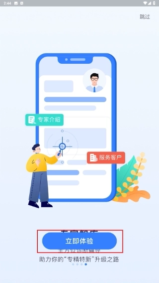 2、在引导页面点击【立即体验】按钮,即可进入应用的功能主界面,开始使用平台提供的各项服务。