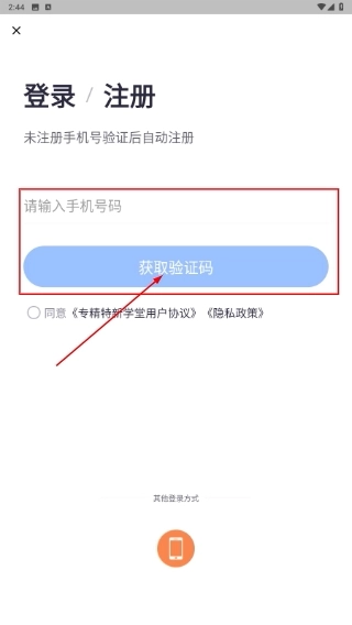 4、进入登录/注册页面后,在【请输入手机号码】输入框中填写手机号,点击【获取验证码】按钮,勾选相关协议并完成验证步骤,就能完成手机号注册并同步登录账号。