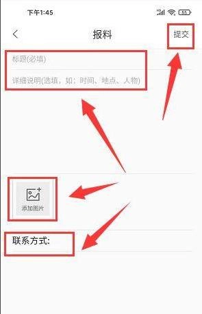 最后在报料页面,依次输入标题、填写详细说明、添加图片、留下联系方式,然后点击【提交】按钮。