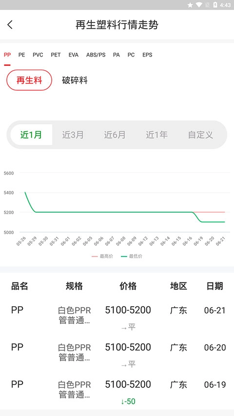点击“行情走势”后,就能查看某一类材料最近一段时间的行情趋势。