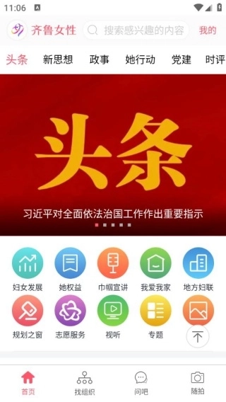 2、首页设有头条资讯供用户阅读,同时还能获取新思想、她行动等相关内容。