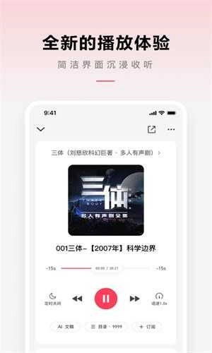 这里聚集了海量的正版书籍,所有都能免费收听!不管是热门科幻作品《三体》、历史经典读物《人类简史》,还是深受大家喜爱的《庆余年》《剑来》《医妃倾天下》《总裁老公惹不得》这类作品,都可以畅快聆听。