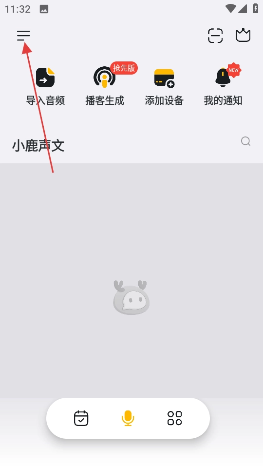 在小鹿声文首页,点击左上角的三条横线图标,展开侧边栏。