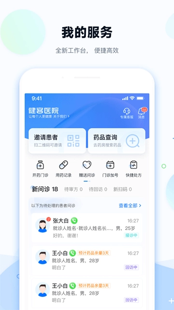 线上诊疗闭环服务体系:医生在线完成接诊与处方开具,药品通过线下渠道配送到家,患者无需出门即可完成复诊流程,医生能够同步管理患者的相关信息,从而实现诊疗全流程的线上化无缝衔接。