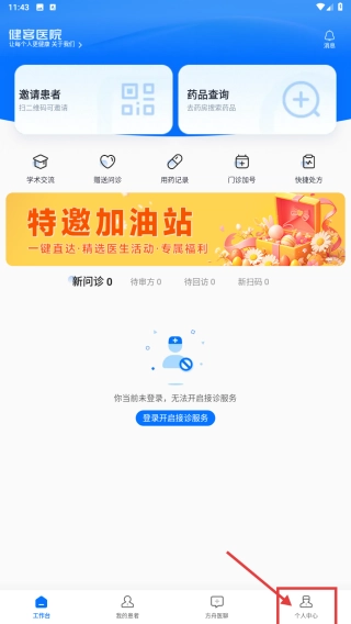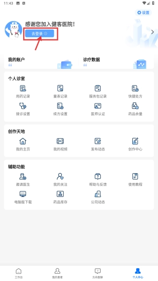 打开医疗类应用,点击底部的个人中心选项,即可进入个人中心页面。