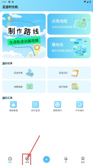 打开旅行类,点击底部发现选项,进入发现页面。