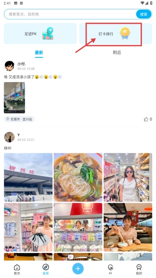 在发现页面,点击打卡排行选项,进入打卡排行列表。