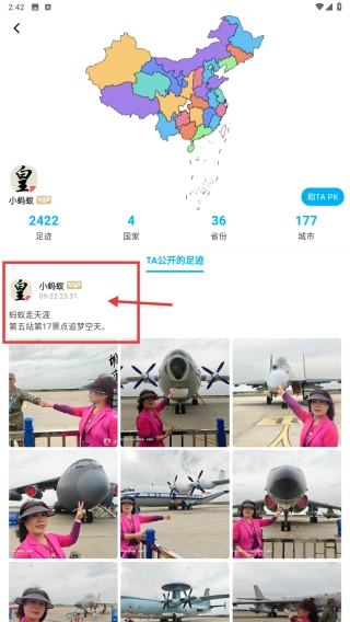 在个人主页,查看小蚂蚁的足迹、打卡地点等旅行相关信息。