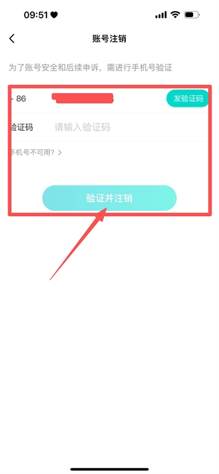 6、进入手机号验证页面后,输入验证码,点击“验证并注销”按钮,即可完成账号注销流程。