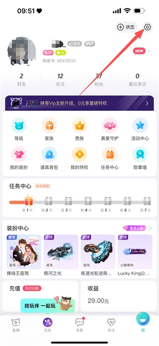 2、进入个人页面后,点击右上角的设置图标,即可进入设置页面。