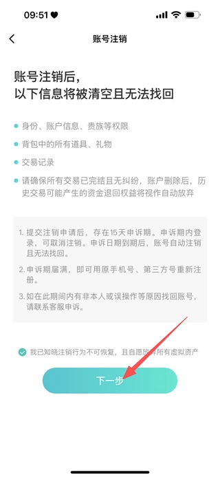 5、进入账号注销说明页面后,勾选自愿放弃所有虚拟资产的选项,再点击下一步按钮。