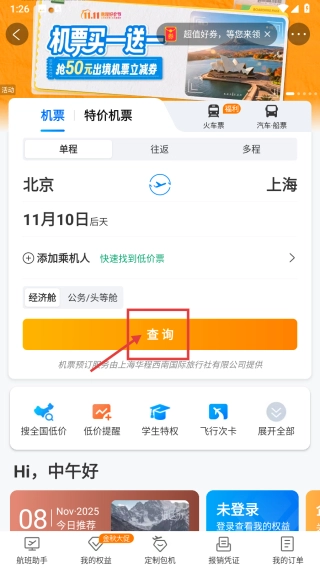 打开旅行类应用,点击机票分类标签,进入机票查询页面。