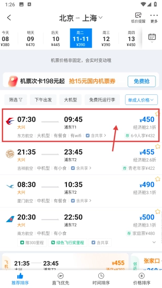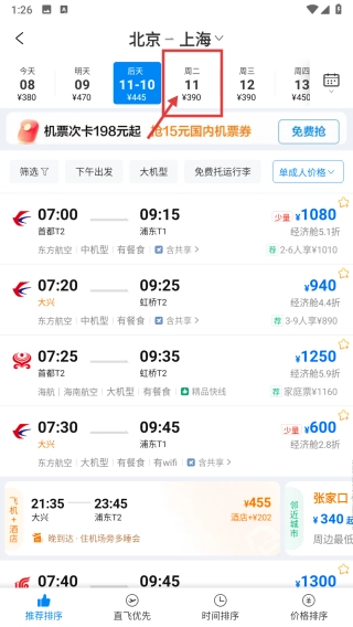 在航班列表页面,选定11月11日(周二)的航班日期,筛选出当天的航班。