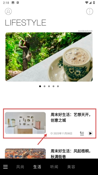 在生活资讯板块,找到周末好生活栏目下的“艺想天开,创意之城”资讯内容,点击进入该资讯的详情页面。