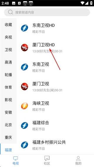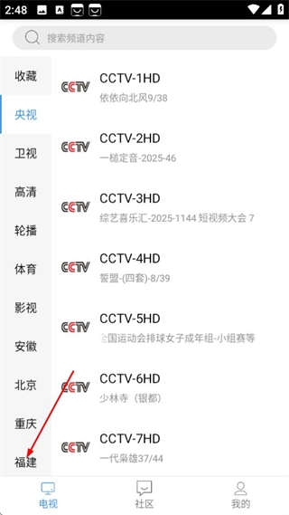 在悠兔电视的首页,点击左侧的“福建”选项,即可进入福建频道的列表页面。