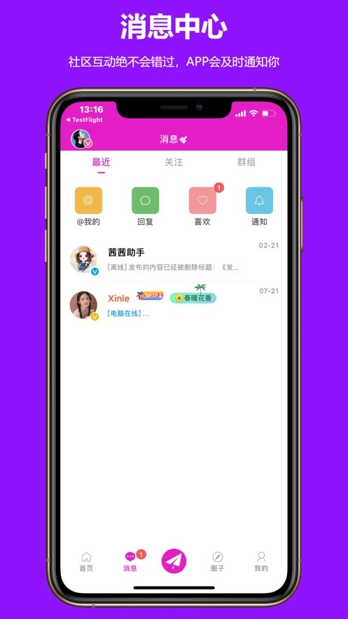 3.消息页面会向你推送通知、私信、群消息以及评论回复等内容。