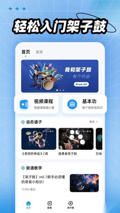 从入门到精通的进阶课程,几分钟掌握一个节奏型,一节课学会一首歌曲。视频教学、动态谱演示、鼓谱详解以及学鼓小贴士,助你轻松学习,快乐玩鼓。