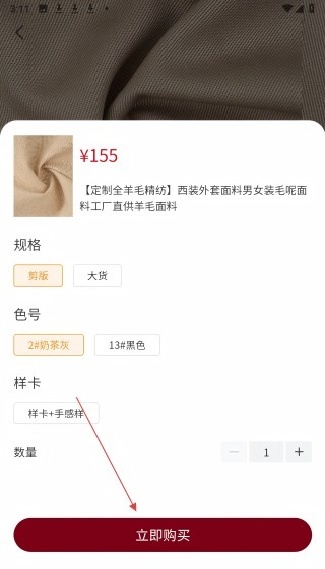 2. 进入商品详情页面后,点击“立即购买”按钮,随即会弹出用于选择规格的窗口。