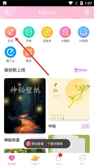 进入粉粉日记首页后,点击【日记】功能图标即可使用日记功能;此页面同时设有手帐、记账本等其他功能入口,方便记录各类不同内容。