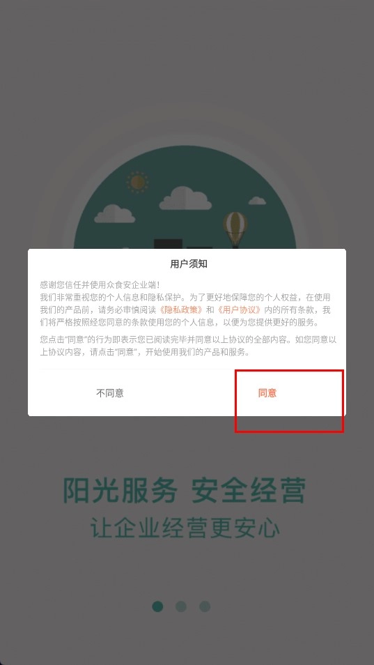 1、点击【同意-功能按钮】,以同意用户须知里的《隐私政策》与《用户协议》。
