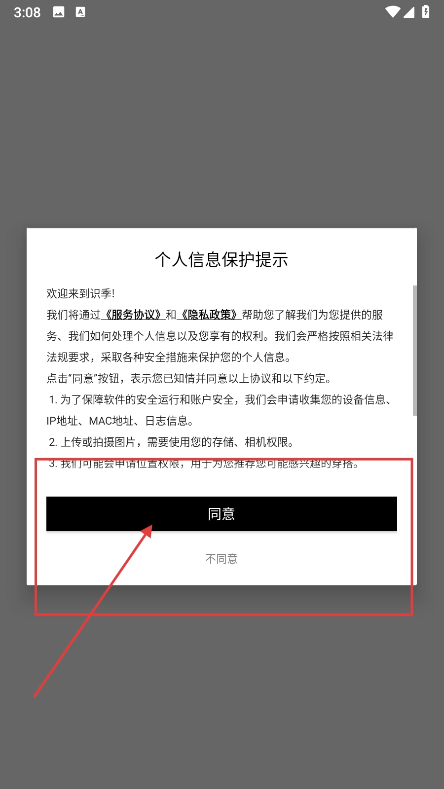 1、使用【识季】前,需点击【同意】按钮,确认已知情并同意《服务协议》《隐私政策》及相关个人信息收集约定。