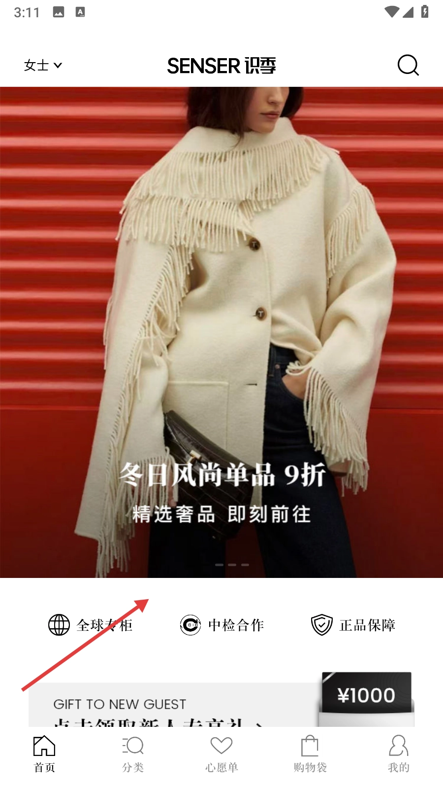 4、登录后进入【SENSER-识季】首页,可查看冬日风尚单品9折等活动,还能了解全球专柜、中检合作、正品保障等服务。