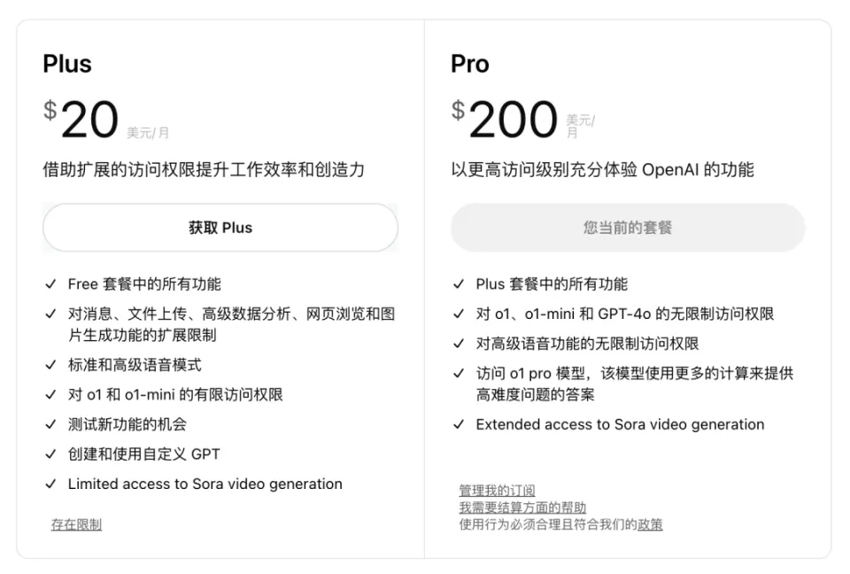 ChatGPT 的付费用户现在可以使用Sora了,付费有两档Plus或者Pro权益各不相同