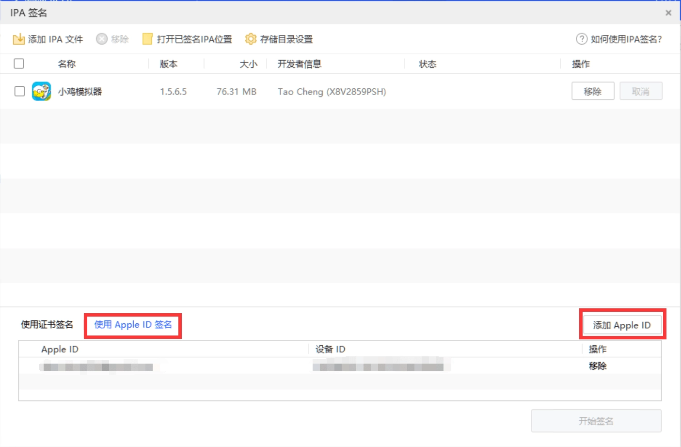 第三步,完成IPA文件的选择后,点击左下方的“使用Apple ID签名”选项;若列表内无可用ID,需点击右侧的“添加Apple ID”按钮并执行添加操作。