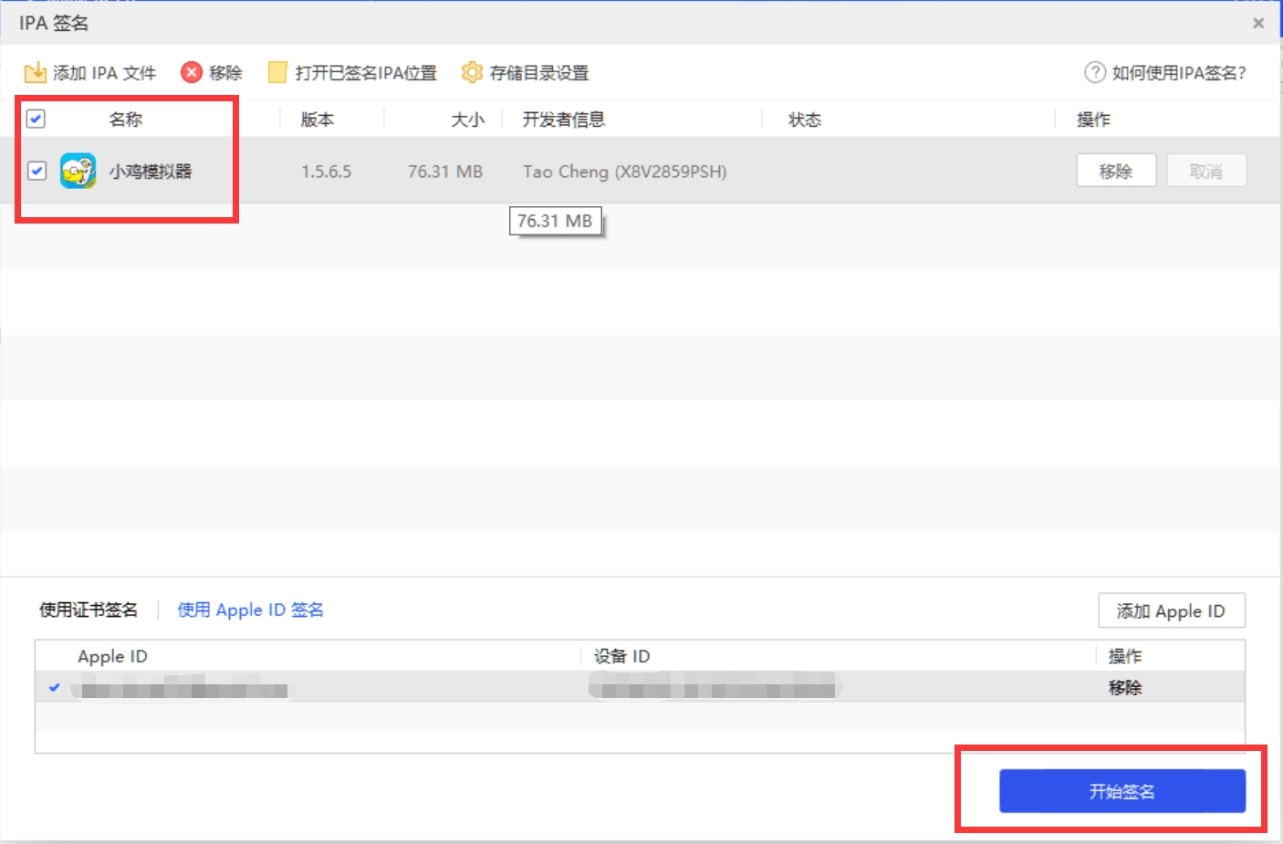 第四步、在上方的列表框中选中签名IPA文件,接着点击右下方的“开始签名”按钮。