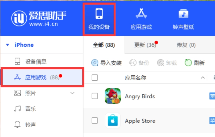 第六步,请确保手机与爱思助手保持正常连接,接着在爱思助手顶部的导航栏里点击“我的设备”选项,再从左侧的菜单栏中找到并选择“应用游戏”,这样就能看到当前手机上已安装的应用和游戏的列表了。
