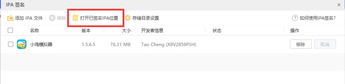 第五步、等签名操作完成后,就可以点击左上方的“打开已签名IPA位置”选项,从而找到已经完成签名的IPA文件。