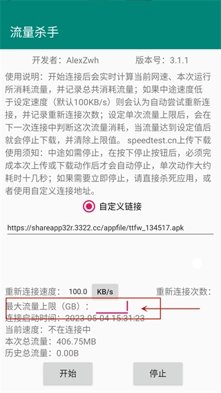7、若需立即停止,请直接关闭应用,或使用自定义连接地址。