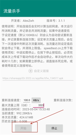 5、开始连接后,系统会记录连接启动时间、当前网速、本次运行消耗的流量,以及累计消耗的总流量。