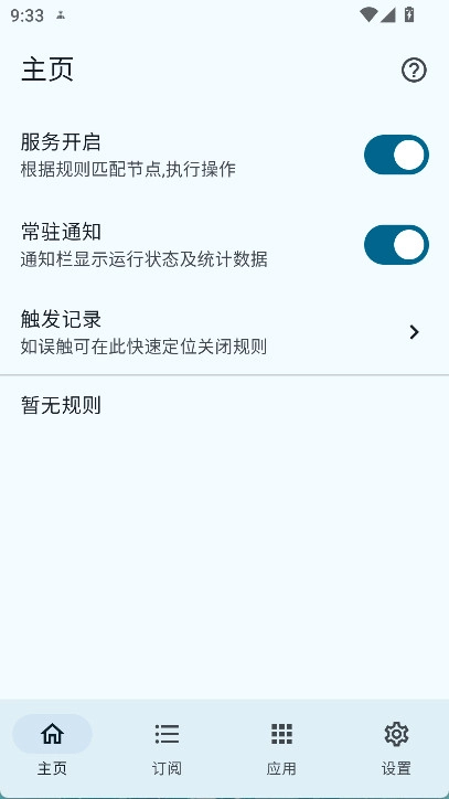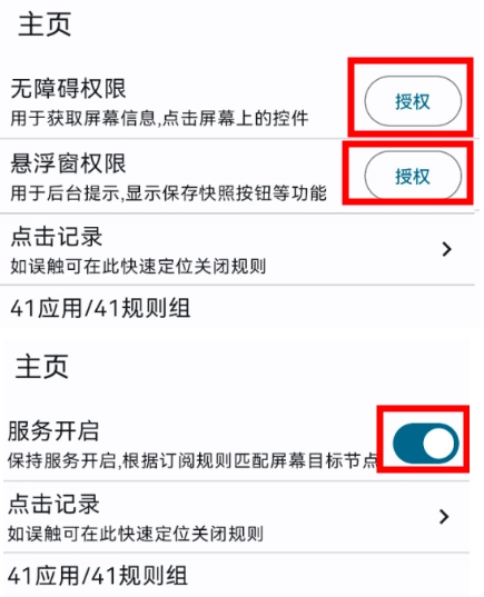1. 接着安装GKD,打开该软件后,在主页按顺序授予无障碍权限与悬浮窗权限,服务会默认自动启动。