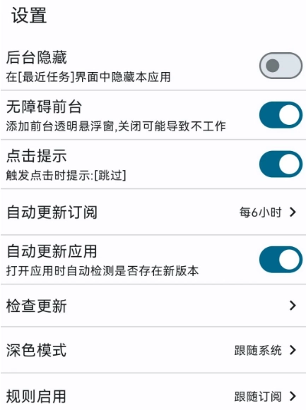 在设置界面里,您能够对后台隐藏、点击提示、订阅自动更新时间等功能进行配置。
