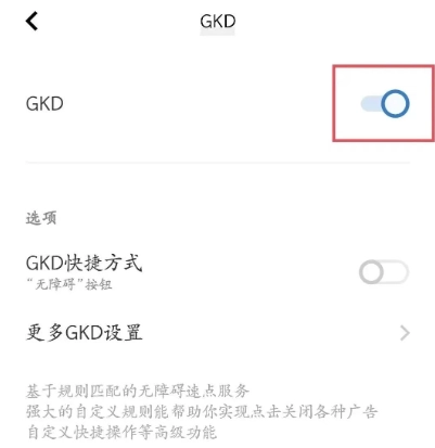 只需在无障碍功能里点击“已服务”,找到GKD并开启服务,就能正常使用了。
