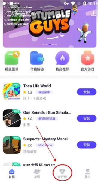 1、首先在本站打开playmods,接着点击排行榜。