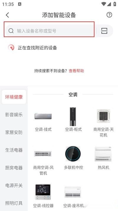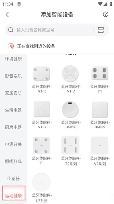打开已安装完成的TCL体脂秤App,进入到主界面。在界面中找到“设备”或者“添加设备”的选项,点击进入后,选择左侧下拉框里的运动健康,接着进入选择体脂秤型号的页面。