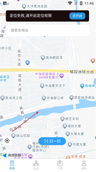 进入充电页面后,能在地图里搜索充电站。要是定位没成功,点击“去开启”按钮打开定位权限,这样就能更精准地找到附近的充电站了。