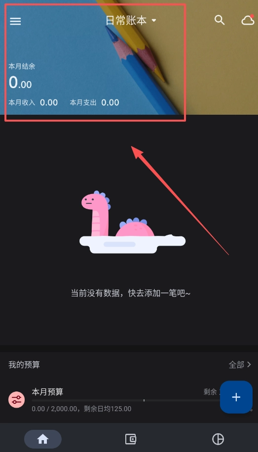 进入日常账本页面后,系统会清晰呈现本月结余、收入支出等核心数据,首次使用时还能看到预算管理功能。