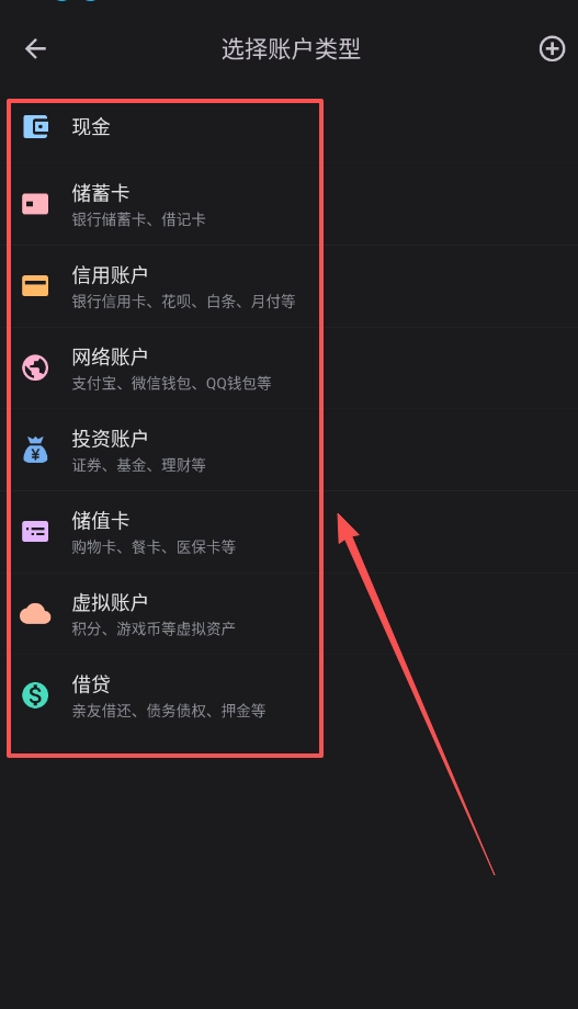 当需要添加新账户时,系统提供了现金、储蓄卡、信用账户等七大类选项,用户可依据自身实际需求挑选相应的账户类型。
