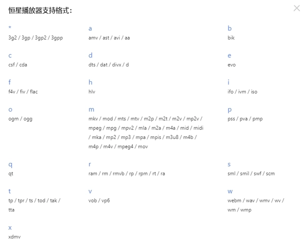 如下图所示,按照字母顺序表进行所支持格式的查找