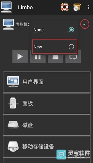 1、点击上方“虚拟机配置”右侧显示的“None”,在弹出的窗口里选择“New”选项来完成创建操作。