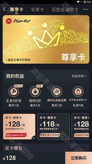 4、【尊享卡】页面包含尊享卡、宅享卡、百胜会通吃卡等各类特色权益,用户开通相应卡片后就能享受对应的权益内容。
