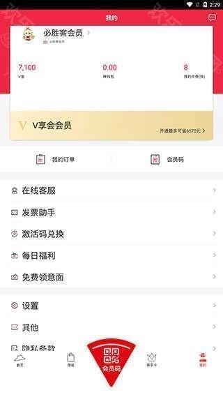 3、在【会员码】页面,我们可以出示会员码、支付码等信息,从而完成扫码点餐、面对面支付等操作。