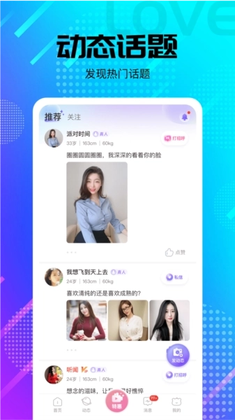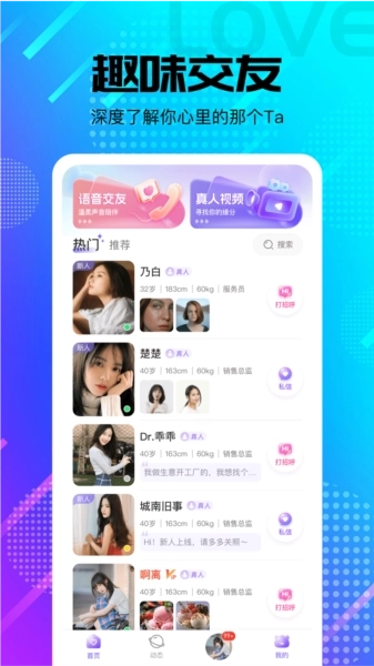 3、丰富互动功能:直播间、动态分享等多元玩法,让用户在轻松娱乐中增进了解,拓宽交际圈。